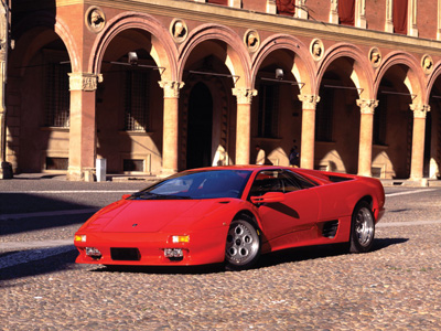 А в январе 1990 года в Монте-Карло публике был представлен прямой наследник грозного Countach – Lamborghini Diablo. Внешне Diablo не был похож ни на одну модель компании, это был новый виток в дизайне этой марки. Он был одновременно элегантным и агрессивным. Точные, ярко выраженные острые грани и линии придавали автомобилю агрессию. Автомобиль был оборудован очень модными на то время убирающимися передними фарами и открывающимися вверх дверями. В конце 80-х годов Lamborghini перешла под контроль Chrysler, и дизайн получился совместным, итало-американским, что можно заметить в первую очередь по смещённому вперёд салону.