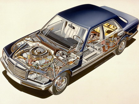 380SEL AMG - самая доступная версия. Двигатель - V8 объёмом 3.8 литра, мощность - 230л.с. Это единственная версия, оснащавшаяся в базе МКПП-5 (за доплату - АКПП-4).